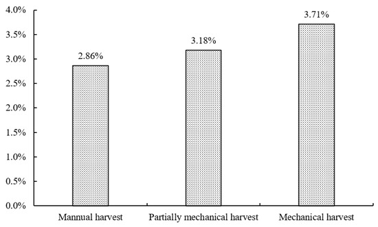 The harvest losses could be different depending on the type of harvesting method. We continued to examine the harvest losses for different harvest methods. Our study defined three different types of harvest methods: manual, mechanical, and partially mechanical. “Manual harvest” refers to farmers not using mechanical operations in any harvest process (including harvesting, threshing, and grain cleaning); “mechanical (or machine) harvest” and “partially mechanical” refer to farmers using mechanical operations in all or some harvesting processes, respectively. The results showed that mechanical harvesting resulted in higher losses (Figure 3), consistent with previous studies [14,15]. However, manual harvesting is less efficient than mechanical harvesting. With the transformation of China’s agriculture, the use of machinery in production has become mainstream, which has led to a decrease in the number of farmers using manual harvesting. In our survey, only 12% of farmers used the manual harvest method in the harvest stage.
