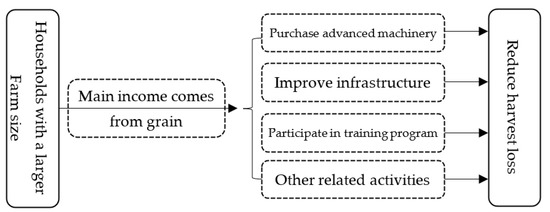 Few studies have considered the impact of farm size on harvest losses. In China, more than 500 million people still live in rural areas, and family-based smallholder production continues to be the main way for Chinese farmers to make a living [19]. To ensure fairness, land distribution under the household contract responsibility system adopts the principle of equality. Due to the large population, for each household, the land area is limited [20], which prevents large-scale operations, decreases operating efficiency, increases management costs, and is not conducive to mechanization [21].