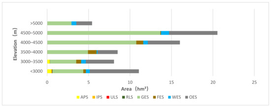 In terms of the spatial distribution of second-level land classes, the land areas of the APS, IPS, ULS, and RLS portrayed a decreasing trend with increasing altitude. Notably, the maximum numbers of APS, IPS, ULS, and RLS all appeared in the areas having altitude less than 3000 m. The areas of GES and OES portrayed a trend of initial decrease, followed by an increase. This was followed by a decrease with increasing elevation; notably, the maximum numbers of GES and OES appeared at altitudes of 4500–5000 m and <3000 m, respectively. The FES portrayed an initial increasing trend with increasing elevation, followed by a decreasing trend; the maximum number appeared at an elevation of 3500–4000 m above the sea level. The WES area portrayed a trend of fluctuation; the maximum number of WES occurred at an altitude of 4500–5000 m.