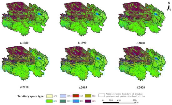 Territorial spatial pattern from the perspective of Production-Living-Ecological space for the years (a) 1980; (b) 1990; (c) 2000; (d) 2010; (e) 2015; (f) 2020.