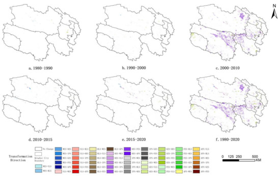 Based on the change rate of the secondary spatial structure in Qinghai Province, we could deduce that, during 1980–2020, the growth rates of the areas of the IPS, ULS, and RLS were 5.66, 3.67, and 0.65%, respectively, while those of the FES and OES portrayed a decreasing trend (−0.02 and −0.24%, respectively).