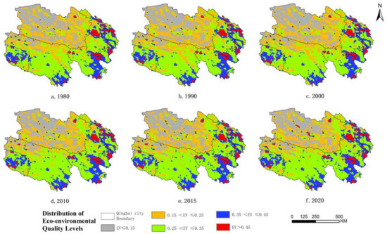 Distribution of eco-environmental quality levels in Qinghai Province from 1980 to 2020.