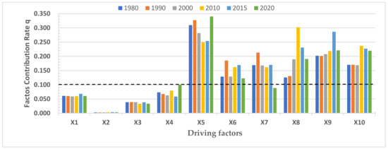 Additionally, we analyzed the following factors: X6 (year-end total population), X7 (population density), X8 (gross domestic product, GDP), X9 (non-agricultural proportion), and X10 (road network density). From the perspective of factor interpretation, X6–X10 had a great impact on the eco-environmental quality of the study area, which was the main driving force. The impact of X6 and X7 on the ecological environment of the study area fluctuated, but the overall level remained above 0.100, indicating that X6 and X7 had a great impact on the ecological environment of the study area. However, the q value of X7 decreased to 0.089 in 2020, indicating that the influence of X7 on the ecological and environmental quality weakened in 2020. Notably, X8, X9, and X10 portrayed an initial increasing trend, followed by a decreasing trend from 1980 to 2020; however, the values increased to different degrees, compared with 1980, indicating that the influence of X8–X10 on the eco-environmental quality of the study area was increasing.