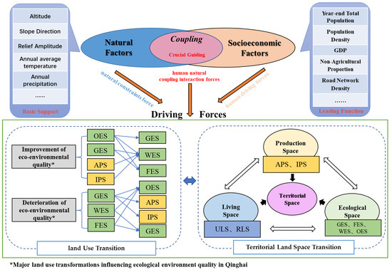 According to relevant studies, the rapid development of social economy and urbanization is accompanied by the deterioration of eco-environmental quality to a certain extent [25,60,61]. This degradation is usually caused by the change of territorial spatial patterns due to land use transformation (Figure 7). Qinghai Province is located inland of north-west China, and most of its areas are restricted development zones (areas with weak resource and environment carrying capacities, with poor conditions for large-scale ag-glomeration of economy and population, but related to ecological security in a large area of the country) [62,63]. The causes of eco-environmental quality changes in Qinghai Province are consistent with those in regions and cities with rapid economic development and high urbanization rate in China, such as Yellow River Delta, Beijing-Tianjin-Hebei region, Yangtze River delta economic zone, etc. It is mainly due to economic expansion and urban occupation of ecological space that APS and ecological land are converted into ULS and RLS in territorial space. However, because most of the area in Qinghai is a restricted development zone, it also has a certain comprehensiveness and complexity, for example, unfavourable ecological space maintenance leads to grassland and forestland degradation and wetland atrophy.