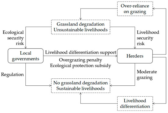 4], and to meet the needs of herders for survival and development while avoiding overgrazing. Exploring effective mechanisms to manage grassland degradation to maintain sustainable functions and the services of the grassland ecosystems, and achieve sustainable livelihoods for the local people, is an issue worth exploring. Several studies have shown the impact of the herders’ livelihood constraints on the grassland degradation governance, but there is relatively little analysis of the dynamics of the game process among the stakeholders involved, as well as a lack of multi-scenario analysis for developing effective governance policies. To reveal the mechanism of the impact of the herders’ livelihood constraints on grassland degradation, and to explore an integrated management approach to safeguard the herders’ livelihoods and grassland ecological restoration, this paper constructs an evolutionary game model considering local governments and herders, seeking policy insights to achieve the dual goals of grassland ecological restoration and poverty alleviation for the residents. The main findings of the study are as follows.