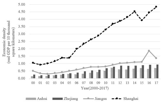 In this study, the economic density is equal to the ratio of regional real GDP (taking 2000 as the base year) to regional area. Figure 3 shows the economic density of Shanghai City, Zhejiang, Jiangsu, and Anhui Provinces from 2000 to 2017. With the highest efficiency of economic activities per unit area, Shanghai presented the strongest economic agglomeration effect. The economic density of the other three provinces is typically ranked as Jiangsu, Zhejiang and Anhui from high to low.