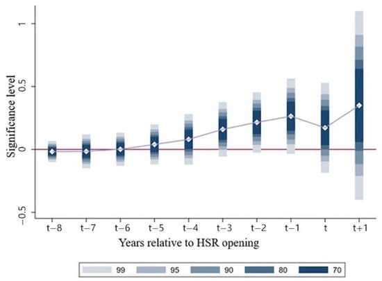 The results of the tests using the leads and the time-trend both indicated that the parallel trend test had been passed. Figure 5 shows that there was no significant difference in economic development level between the control group and the treatment group before the HSR opening, which meets the parallel trend assumption. Therefore, the DID method was considered appropriate to use in this study.