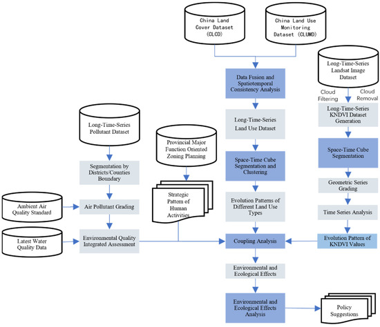 The method of this paper mainly includes three parts: (1) Fusion of multi-source land use data and spatiotemporal consistency analysis, aimed at dealing with spatiotemporal inconsistency in land use classification products in this region. (2) Spatiotemporal cube segmentation and clustering, to realize the classification and identification of different temporal and spatial evolution patterns. (3) The coupling analysis of environmental and ecological effects: through coupling different spatial and temporal evolution modes of land use with environmental pollution and ecological quality evolution, we analyzed the environmental and ecological effects possibly caused by the evolution of different patterns (Figure 2).