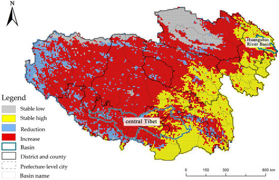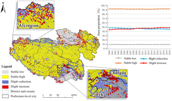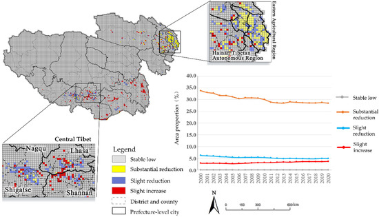In the Tibetan Plateau region, grassland is widely distributed. Except for the Qaidam Basin, Linzhi City, and Cona County of Tibet, the proportions of grasslands in other areas are at a constant high value (stable high grid), and the average proportion of grasslands in the grid reached 91.85% in 2020. The changes of the livestock pattern in the Tibetan Plateau region are mainly reflected in the spatial layout in the past two decades, showing a trend of migration from west to east. In terms of the total amount, the area of grassland in the Tibetan Plateau region has remained basically unchanged, with the decreasing rate only reaching 0.08%. In the spatial pattern, the changes of grassland area from 2000 to 2020 mainly occurred in the peripheral areas of the livestock pattern (Figure 5). In the western and southern areas, such as the northern part of Ali region and Nagqu city of Tibet, the central part of Shannan city, and the border of Linzhi City, grassland areas showed an obvious declining trend. The slight increase grids are distributed near Haixi Prefecture in the northeast and Changdu City in the southeast. In addition, there are scattered slight increase grids in the northwest of Ali region. The proportion of grassland in these grids has increased from 1.91% to 52.52% in the last two decades.