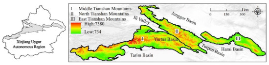 The Tianshan Mountains are the world’s largest independent zonal mountain system, the largest mountain system in an arid region, and the farthest mountain system from the ocean [28]. It is one of the world’s seven major mountain systems, connecting China, Kazakhstan, Kyrgyzstan, and Uzbekistan. The Tianshan Mountains in Xinjiang (TS) are located at 73°50′28″–95°33′56″ N and 39°24′40″–45°23′8″ E, with a total area of 23.53 × 104 km2 (Figure 1). The elevation in TS ranges from 734 to 7380 m. The region includes not only high-altitude mountains but also some basins (e.g., Yurtus Basin) on the northern and southern slopes and valleys (e.g., Ili River Valley) in the western part of the TS [14]. The region has a typical continental climate, with an annual average temperature of 1.03 °C and annual average precipitation of 406.97 mm. The TS has all the typical mountain altitudinal natural zones in a temperate arid zone and is located in the mountains of Central Asia among the global biodiversity hotspots [29], the Global-200 ecoregions [30], and the priority areas for biodiversity conservation in the Tianshan Mountains–southwest Junggar Basin [31]. According to the “Guideline to Establish the Mechanism of Natural Protected Areas with National Parks as Backbone” released in 2019, there are 59 protected areas (PAs) in TS, including one World Natural Heritage site, nine nature reserves, and 49 nature parks, which account for 33.91 % of the protected areas in Xinjiang. The total area of PAs in the TS is 2307.46 km2, accounting for 18.94 % of the study area. To quantitatively analyze the spatial variation, we divided the total Tianshan Mountains (TTS) into three sub-regions: the Middle Tianshan Mountains (MTS), the North Tianshan Mountains (NTS), and the East Tianshan Mountains (ETS).
