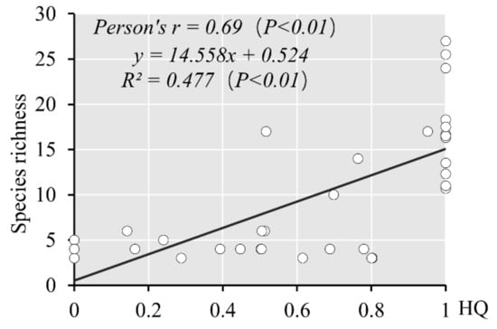It is necessary to test the effectiveness of the modified HQ model for assessing biodiversity. The species richness was used to characterize biodiversity, which was obtained from the literature [13,42]. The fitting results (Figure 2) showed that this model showed a highly significant Pearson’s r (0.69, p < 0.01) and regression slope values (14.558, p < 0.01), with an R2 = 0.48, indicating that there was a good linear relationship between the two. Thus, this model can be applied to the field of biodiversity estimation.