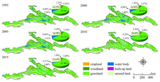 Grassland was the dominant land-use type of the TS, and its total area accounted for almost 60%, followed by unused land (Figure 3). The land-use structure underwent a rapid change during the study period. The areas of cropland, grassland, built-up land, and unused land showed a tendency to increase to varying degrees. The area of grassland and unused land increased the most, reaching 10,345.98 km2 (7.45%) and 3382.57 km2 (5.38%), respectively, and the area of construction land increased the fastest (285.91%). The area of woodland and water body decreased by 3919.17 km2 (30%) and 11,091.12 km2 (65.54%), respectively. Overall, the area of artificial landscape (e.g., cropland and built-up land) increased by 1283.62 km2 (37.55%), while the areas of natural landscape (e.g., woodland, grassland, water body, and unused land) decreased by 1281.74 km2 (0.55%).