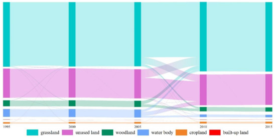 As shown in Figure 4, land-use transitions can be divided into two stages—smooth change (1995–2005) and fast change (2005–2015). From 1995 to 2005, the grassland was mostly transformed into other land-use types, which mainly contained unused land (1085.59 km2), cropland (760.72 km2), and woodland (758.29 km2). The area of unused land transferred out up to 1452.12 km2. From 2005 to 2015, a large amount of unused land was converted to grassland, with an area of 18,563.39 km2. The area of grassland and water body decreased rapidly by 19,711.91 km2 and 13,521.97 km2, respectively. Water bodies were mainly converted into unused land and grassland, while grassland was mainly transformed into unused land and woodland. Overall, under the background of global climate change, ecological land, such as woodlands, grasslands, and water bodies, became more vulnerable. This result is consistent with Wei’s research [16].