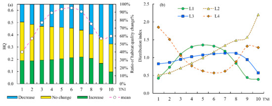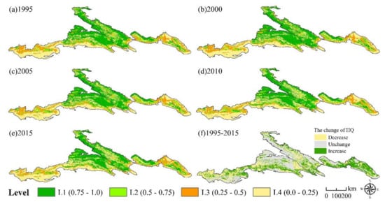 From 1995 to 2015, the HQ at different terrain niches presented three characteristics. First, the HQ showed an inverted “U” type (Figure 8). It increased at TNI 1–5 and decreased at TNI 6–10. The important habitats were mainly distributed at TNI 3–8, which were the main distribution areas of ecological land, such as grassland, forest, and water bodies. Therefore, people should give importance to the monitoring of HQ in these terrain gradient areas. The structure and composition of land use were relatively stable. Second, the HQ impairment and constancy areas increased with the terrain niche index, while the gain areas changed slightly. Third, the distribution index of L1 was greater than 1 at TNI 3–7, which showed a dominant distribution, but habitat quality L4 showed the opposite trend. The distribution index of L2 appeared to be dominant when the TNI was greater than 5. In general, landscape heterogeneity increased at moderate to high terrain levels compared to the low terrain levels in arid mountain ecosystems, indicating that they can support more species, habitat richness, and habitat diversity.