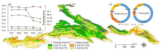In terms of the spatial pattern and habitat level (Figure 7b,c), most of the nature reserves and nature parks were distributed in the region of very important habitats and important habitats, both of which covered more than 75% of the area. Nature reserves were mainly distributed in the region of very important habitats, followed by important habitats. Nature parks had an overwhelming superiority of very important habitats, indicating that nature reserves and nature parks play a vital role in supporting ecological security. Nevertheless, conservation effectiveness and design need to be extended beyond the existing PA network to protect an adequate representation of species and habitats [44]. Moreover, we should not only get information on how much area needs protection, but, more importantly, also where to protect biodiversity and habitats.