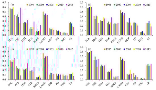 The PD value of each factor from 1995 to 2015: (a) the total Tianshan Mountains area, (b) the east Tianshan Mountains, (c) the north Tianshan Mountains, and (d) the middle Tianshan Mountains.