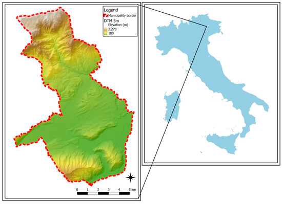 - Tarquini, S.; Isola, I.; Favalli, M.; Battistini, A. TINITALY, A Digital Elevation Model of Italy with a 10 Meters Cell Size (Version 1.0) [Data Set]. Istituto Nazionale di Geofisica e Vulcanologia (INGV). 2007. Available online: https://data.ingv.it/dataset/185#additional-metadata (accessed on 1 August 2022).