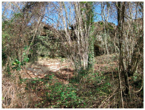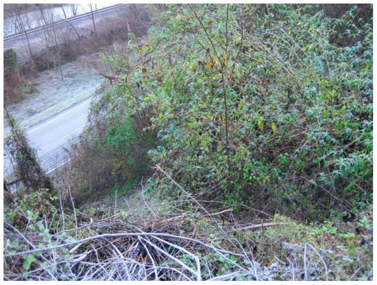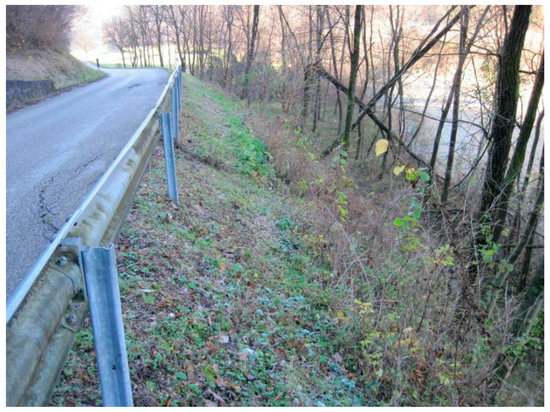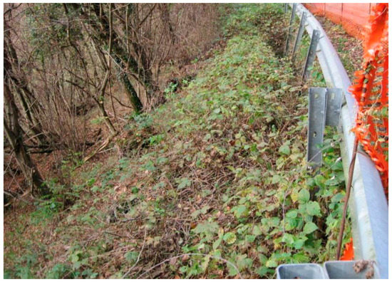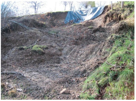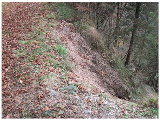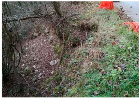 Figure 4. Landslide photograph code 025021_02c. - Code 025021_03c: Rotational sliding with retrogressive evolution due to water concentration of road water (Figure 5). Landslide in conglomeric and fluvioglacial materials. Face L = 10 m, H = 10 m, Sp = 1–2 m.