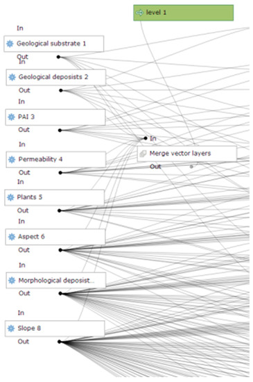 Landslide susceptibility analysis is a very topical issue; however, in this case, the susceptibility analysis is performed in relation to an extreme evet, so extremely precipitation-dependent phenomena such as debris or earth flows were taken into account [27]. From an operational point of view, no less than 9 landslides were identified immediately after the event and reactivated. These landslides were studied through 8 geological–geomorphological and vegetation parameters that characterised the landslide zone: permeability of the lithotype, type of vegetation cover, aspect, slope, type of substrate, deposits, recent deposits, and landslide map. The slope was divided into classes arbitrarily on the basis of other similar research, The aspect was differentiated by taking into account that the wind rose into 8 classes of 45° each. Permeability, on the other hand, was divided into very low, low to medium, medium to high, and very high, dividing it between porosity in deposits and fracturing in rocks. The vegetation was based on the subdivision of the area carried out by ISPRA (Istituto Superiore per la Protezione Ambientale, Higher Institute for Environmental Protection) in 2010 [28], while the geological characterisation and the deposits characterisation were based on the geological map sheet of Belluno [29].Finally, the presence of landslides and their activation status were analysed by means of the PAI (Piano di Assetto Idrogeologico, Hydrogeological Structure Plan, drawn up by the Basin Authority of the Isonzo, Tagliamento, Livenza, Piave, and Brenta-Bacchiglione rivers) This landslide susceptibility analysis was inspired by the weight of evidence [15]; however, it is a more conservative and precautionary method, because it does not discriminate parameters by assigning them a value, but rather only verifies the presence of a given parameter. The analysis was carried out using the QGIS software tool, which made it possible to assess the characteristics of each individual area on the basis of the chosen parameters that produce an increase in landslide susceptibility. A QGIS ‘extraction by location’ tool made it possible to extract all geological–geomorphological and vegetation features under each individual landslide triggered by storm Vaia. Subsequently, a series of ‘clips’ was made between polygons according to the level, so that each polygon was clipped with each of the others, and then ‘merge’ was performed to create the level.