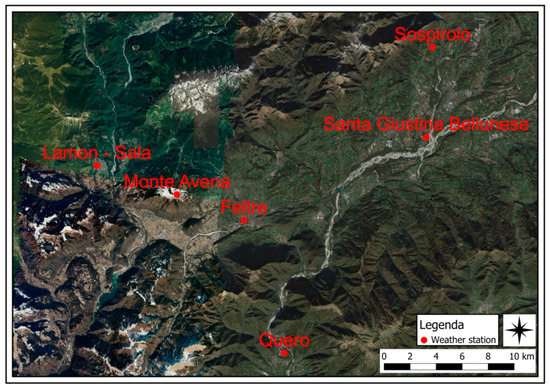 In this case, Sentinel-2 maps with a resolution of 10 m were used to calculate the NDVI and the image processing level used was L1C. Using QGIS software, these satellite images were processed and the NDVI was calculated based on the procedure described above; the acquisition took place once before the event on 11 October 2018 and once after the event on 31 October 2018, selecting days with negligible cloud cover. The value of the NDVI can vary between −1 and 1; a value of −1 is associated with bodies of water, while values between 0 and 0.2 are associated with bare soil. NDVI values between 0.2 and 0.4 correspond to areas with sparse vegetation; moderate vegetation tends to vary between 0.4 and 0.6; and anything above 0.6 indicates the highest possible density of green leaves [31]. The wind gust was then modelled with WindNinja software [32], software that applies fluid dynamics to spatialise the wind on a topographic surface. Data from 7 weather stations in the area with anemometers were entered into the model: Sospirolo, 426 mslm; Monte Avena, 1415 mslm; Lamon, 650 mslm; Feltre, 264 mslm; Quero, 252 mslm; and Santa Giustina Bellunese, 278 mslm (Figure 13).