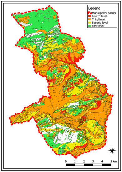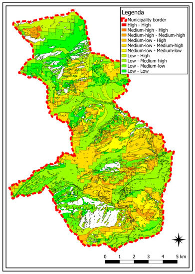 Finally, a last map was drawn up that can be of immediate use to land planners, because it allows them to assess both geomorphological susceptibilities, i.e., from landslides, and biological susceptibility, i.e., from tree felling. To do this, all possible combinations of susceptibility were considered, as shown in the legend in Figure 22, to allow the two maps to be synthesised and to have a single tool to consult.