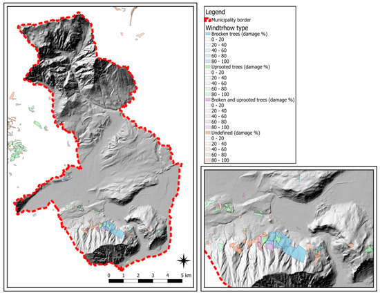 In order to produce a susceptibility analysis of forest species from an extreme wind event, it is necessary to go through several steps. First, areas with a high number of windthrow trees caused by storm Vaia were mapped; the areas were identified using GIS software on the basis of the census conducted by the municipality of Feltre (Figure 16). In particular, the census conducted and subsequently digitised, in Figure 16, shows the different percentages of broken trees, uprooted trees, broken and uprooted trees, and undefined damage in the different areas.
