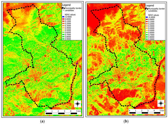 NDVI of the area before and after the event. Images from the satellite Sentinel-2B, acquisitions of 11 October 2018 (a) and 31 October 2018 (b).