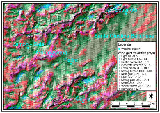 Subsequently, based on the wind speed and direction values of the available weather stations, the area was modelled to assess the variation in speed determined by the topographic surface. To obtain this map, maximum wind gust data were taken from 2010 to 2022 (Figure 18).