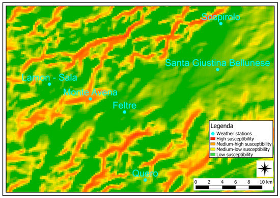 Susceptibility map for extreme precipitation events in the municipality of Feltre.