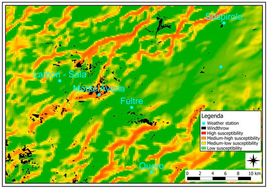 The highest susceptibility values, characterised by the colour red, were spatially located in Figure 19. The Veneto Region’s census of trees felled by wind, superimposed on the wind model (wind damage susceptibility map), shows a localisation of damage in areas with the highest increase in speed (Figure 20). There is a good correspondence between the highest wind speed values and the greatest damage, with a few extremely localised exceptions.