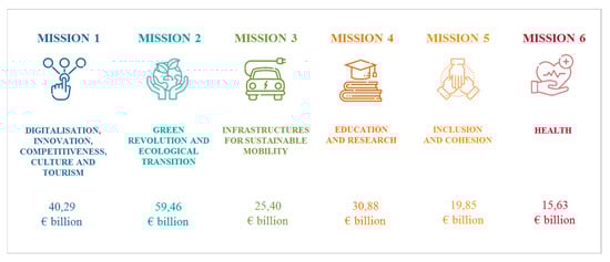 In the context of the Next Generation EU [3], aimed at promoting a “sustainable, uniform, inclusive and equitable recovery” following the crisis caused by the COVID-19 pandemic, in Italy, the NRRP definitively approved the Council’s Implementation Decision on 13 July 2021 [4]; this provides a synthetic framework of reforms and measures to be implemented from 2021 to 2026 within the six pillars identified in the European Green Deal [5], i.e., green transition, digital transformation, social and territorial cohesion, health, policies for the next generation and sustainable, smart and inclusive growth.