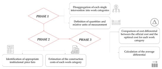 In order to define the methodological approach aimed at minimizing the differential between the estimated construction costs and the set project budget, the computational three-phase articulation is explained: