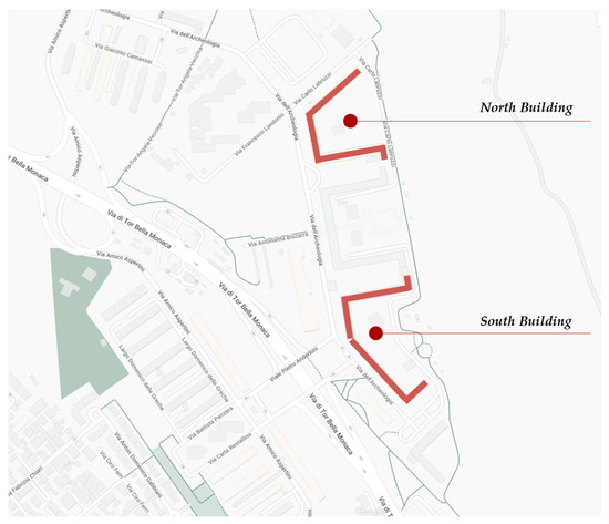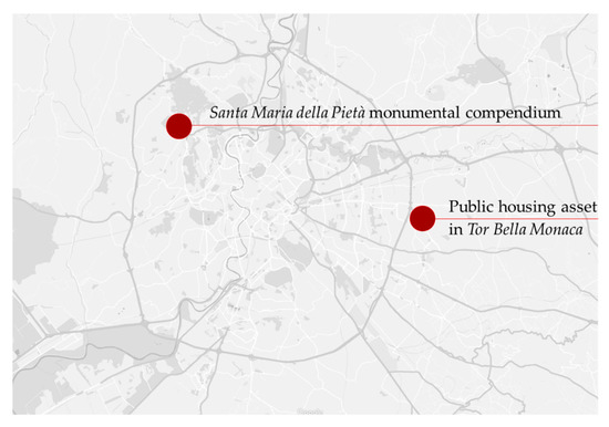 As mentioned before, in the present research, the application of the defined optimization algorithm to two different projects to be realized in the city of Rome is carried out. The two urban regeneration interventions were selected according to the criteria for the selection of the projects among those proposed, and they are consistent with those provided for the NRRP funds. The two initiatives considered are located in two different city of Rome portions: the Santa Maria della Pietà monumental compendium in the northwest of the city, and the public housing asset of Tor Bella Monaca in the east of the city of Rome. In Figure 3, the localization of the two urban transformation areas is shown. Currently, the redevelopment projects in the two areas have already been defined: through the allocated funds, they will be integrated, and the realization process will be implemented. The finalization of the considered projects will allow one to take significant benefits from the NRRP funding uses, by assigning them to two important and densely populated city areas that, currently, need to be totally restored.