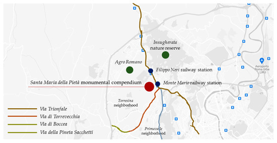 In Figure 4, the monumental compendium of Santa Maria della Pietà, the main transport systems and the surrounding residential neighborhoods are shown.