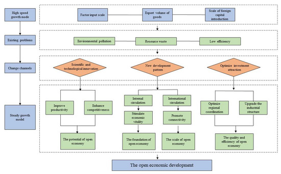 In the past, China’s open economy mainly realized “High-speed” growth by expanding the scale of low-end factor input, blindly expanding production capacity, pursuing the volume of goods exports, and introducing foreign investment [35]. However, this extensive development model has not only caused a series of problems, such as environmental pollution, waste of resources, low efficiency, and so on, but it is also difficult for the traditional development model of the open economy to meet the new needs of China’s socio-economic transformation and upgrading and opening-up strategy and adapt to the new pattern of the global industrial division of labor [36]. The new development model of an open economy emphasizes a steady growth tone, starting with the interaction between supply and demand, interconnection, innovation-driven, industrial structure, regional coordination, and other aspects, and drives the Omni-directional upgrading of the scale of open economy, the foundation of open economy, potential of open economy, the quality and efficiency of open economy, to realize the virtuous circle of economic development and the promotion of international competitiveness [37]. Given this, this paper focuses on the four main focal points of the scale of open economy, the foundation of open economy, the potential of open economy, the quality and efficiency of open economy to analyze the development mechanism of the open economy through the mechanism transmission of domestic and international “Double cycle” new development pattern, scientific and technological innovation, and attracting foreign investment (Figure 1).