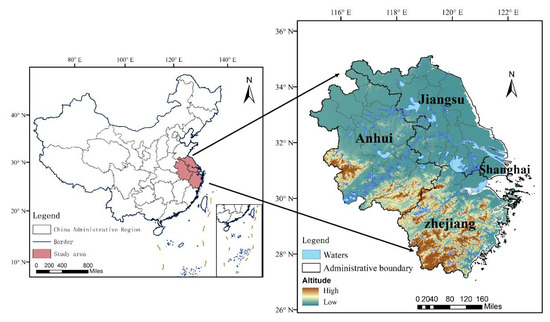 According to the “Outline of the YRDA Integrated Development Plan” officially issued by the State Council in December 2019, the YRDA was planned to cover all four provinces and cities of Suzhou, Zhejiang, Anhui, and Shanghai, with a total of 41 cities. It is an alluvial plain formed before the Yangtze River enters the sea, located in the lower reaches of the Yangtze River in China, bordering the Yellow Sea and the East Sea and at the place where the rivers and the sea meet, with many coastal ports along the river. As of the end of 2019, it played a pivotal strategic role in the overall national modernization and all-round opening pattern as one of the most active, open, and innovative regions in China, with a population of 227 million and a regional area of 358,000 square kilometers (Figure 2).