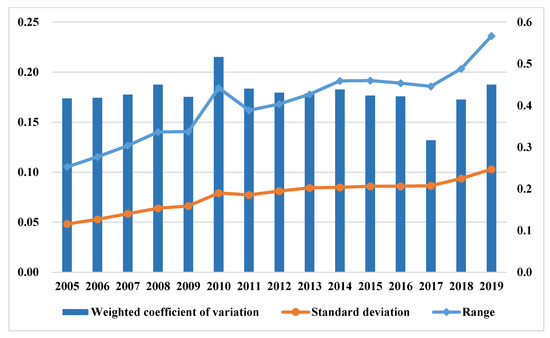 Range and standard deviation: Range and standard deviation are commonly used statistics to describe the degree of data dispersion. The range can reflect the fluctuation range of data, while standard deviation can represent the precision of data. The combination of the two can help us have a more comprehensive understanding of the changes in the level of open economic development in the YRDA. Therefore, in this study, the range () and standard deviation (σ) were used to reflect the absolute differences in the level of open economy development in the YRDA. The formulas are as follows: