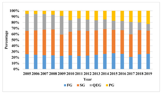From the point of view of evaluating the four subsystems of the development level of the open economy, the foundation of open economy in the YRDA shows a trend of steady growth, the scale of open economy shows a trend of rising and falling repeatedly. The quality and efficiency of open economy first increase and then decrease. On the whole, the potential of open economy shows a fluctuating upward trend (Table 4). It reflects that the YRDA pays excellent attention to the dimension of the foundation of open economy and potential of open economy, but limited to the bottleneck that open economic structure is unreasonable, it has not effectively realized the coordinated development of quality, benefit, and scale. The Gini coefficient was used to analyze the development differences of each subsystem further. As seen from Table 5 and Figure 4, the overall Gini coefficient of the development level of the open economy in the YRDA from 2005 to 2019 shows a trend of first increasing and then decreasing, indicating that the regional difference shows a fluctuating trend over time. On the whole, the difference in the scale of open economy index subsystem is the main reason for the overall difference in the development level of the open economy in the YRDA, followed by the foundation of open economy index subsystem. Before 2015, the contribution of the open quality and benefits index subsystem to the overall difference is more significant than that of the potential of the open economy index subsystem, and on the contrary, after 2015.
