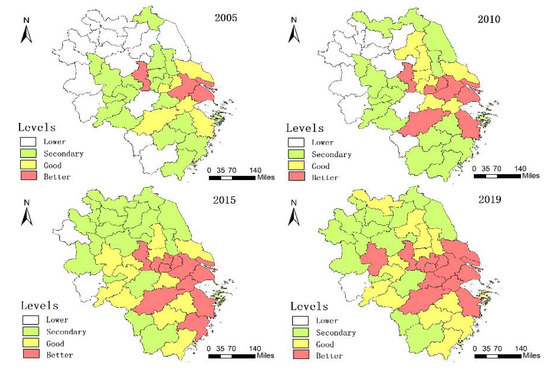 Using the natural breakpoint method in Arcgis, the development level of the open regional economy in each year is stratified, and the threshold is rounded. Finally, it is divided into four groups: (0, 0.4] is a low level, (0.4, 0.8] is a secondary level, (0.8, 1.2] is a good level, and more than 1.2 is a better level and spatial distribution map of the development level of open economy in typical years is drawn.