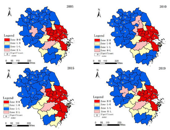 The degree of its local spatial association and distribution pattern could be further measured with the help of , which is calculated as: