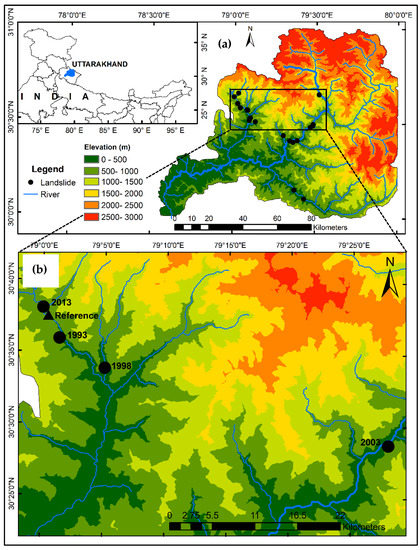Landslides are one of the destructive geological processes that occur throughout the world, and they are especially more frequent in certain areas [1]. The entire Indian Himalayan Region (IHR) is one such area due to the intense monsoon precipitation, frequent tectonic activity, weak geologic condition and very steep and rugged topography [2,3,4,5,6]. Landslides are responsible for huge economic and social losses endangering the people living in the mountains in terms of human life, livelihood, infrastructure and natural resources [7,8,9]. In the Garhwal Himalayas of Uttarakhand state in the IHR, landslides occur frequently because the area is traversed by many faults such as Main Central Thrust (MCT), Main Boundary Thrust (MBT) and Tethyan Thrust, which are tectonically active zones [10,11,12].