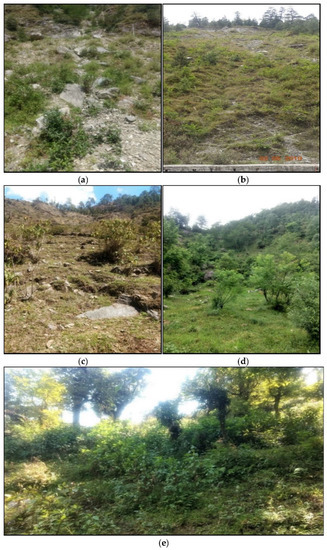 Photos of the study sites. (a) L6, landslide site of 2013, (b) L16, landslide site of 2003, (c) L21, landslide site of 1998, (d) L26, landslide site of 1993, (e) reference (control) site.