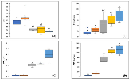 - Doran, J.W.; Parkin, T.B. Quantitative indicators of soil quality: A minimum data set. In Methods for Assessing Soil Quality; Doran, J.W., Jones, A.J., Eds.; Soil Science Society of America Inc.: Madison, WI, USA, 1997; pp. 25–37. [Google Scholar]