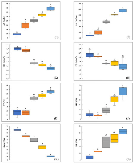 The results indicated that landslides have a significant impact on the soil physico–chemical characteristics after the occurrence of the landslide. All the soil characteristics exhibited significant differences (ANOVA, p < 0.05) between the landslide–disturbed sites and the reference site (Figure 5). However, there is an absence of significant differences (Tukey’s HSD, p > 0.05) in all the chemical properties between the young sites—L6 and L16—and the old sites—L21 and L26—except in AP and AK (Figure 5). Considering soil chemical characteristics, the mean soil pH varies from 4.75–6.86 but pH does not show any clear trend with the age of landslides. The electrical conductivity (EC) increased significantly from 44.85 μS/cm at site L6 to 91.6 μS/cm at site L26 and the maximum has been observed in the reference site. The mean values of SOC range from 0.18% to 2.25% in the landslide–affected sites, which increases gradually with time. However, the maximum concentration of SOC had been found in the reference site. A similar trend is also observed among the studied macronutrients (MN, AP and AK) of the soil (Figure 5).