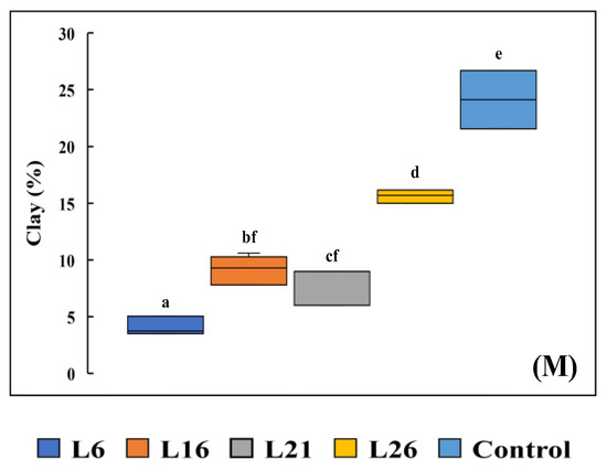 Soil physico–chemical properties in landslide–affected sites (L6, L16, L21 and L26) and reference site (Control). (A) pH, (B) electrical conductivity (EC), (C) soil organic carbon (SOC), (D) mineralisable nitrogen (MN), (E) available phosphorus (AP), (F) available potassium (AK), (G) bulk density (BD), (H) particle density (PD), (I) total porosity (TP), (J) moisture content (MC), (K) sand, (L) silt, (M) clay. Different letters represent significant difference at p < 0.05 (Tukey’s post hoc HSD test).