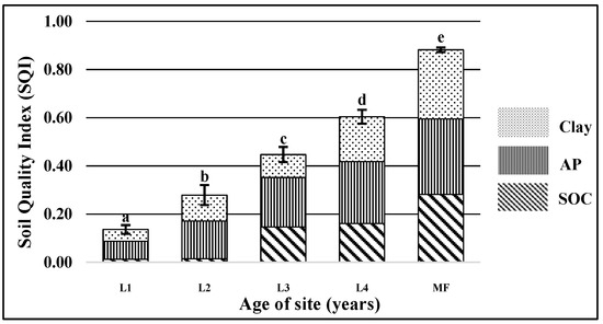 In the restoration of soil quality, SOC plays a key role and also has positive effects on other physical [82] chemical [83] and biochemical properties [84,85], which in turn can be used as a valuable indicator for the assessment of soil quality [19,20]. The restoration of many soil properties follows similar trends and, if resources are limited, then SOC, AP and clay alone could provide adequate measures to assess soil quality and soil development [19]. In addition, Ref. [86] studied the ecological significance of forest age in the functional interpretation of a selected SQI in the Tropical Mountain Cloud Forest (TMCF) of Mexico and the results demonstrated that soil organic carbon, pH and available phosphorus are important evaluation indicators.