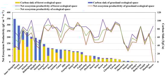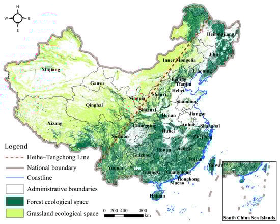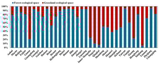 The area proportion of forest ecological space and grassland ecological space in different provinces of China.