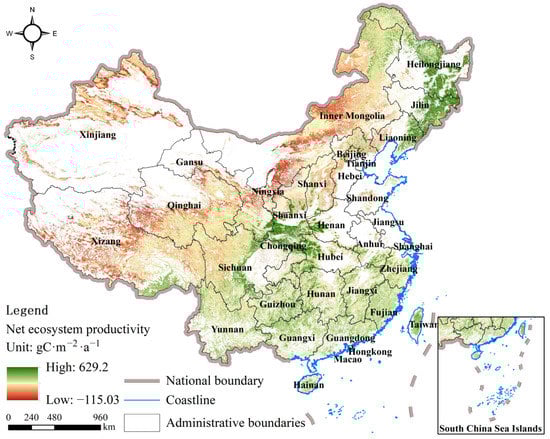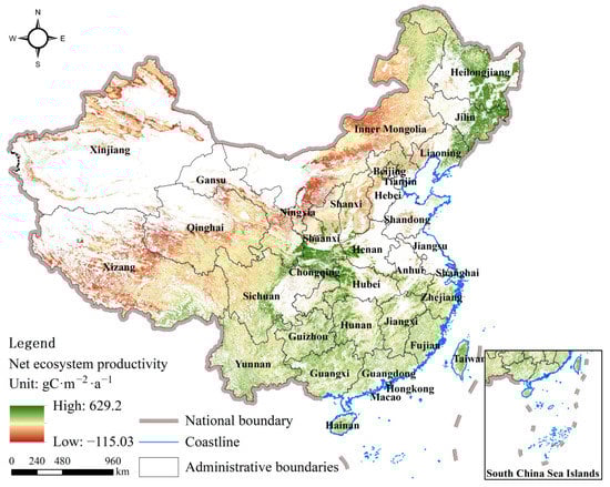 where , , , , and indicate carbon sink, net ecosystem productivity, net primary production, soil microbial respiration, and gross primary productivity of grid at time , respectively. indicates the area. represents the carbon utilization rate, which refers to the efficiency of the vegetation in ES to convert the productivity into biomass and store it in ES. With reference to the research of Chen et al. [] and Parton et al. [] the value is 0.55 in this study.