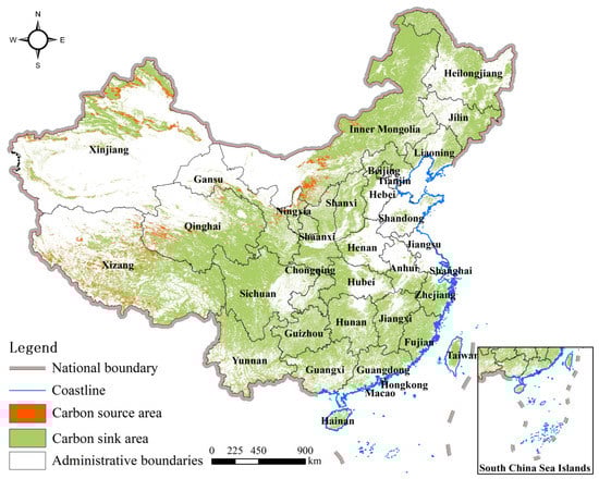 Although the above studies provide a wide range of ideas and methods for the assessment and quality improvement of CS in ES, the following problems remain to be solved. For the study area and scale, current studies have focused on the global to regional scale, but they either study the common problems in large regions from a macro perspective or analyze the characteristics of CS in ES from a small regional perspective. The total area of Chinese ecological space (CES) is about 5.48 million km2, accounting for 57.13% of the total area of China []. With such a large area proportion, the potential of CS in CES is bound to be very large, and there are also large interannual fluctuation characteristics and regional differences. However, there is no research on the accurate accounting of the interannual CS at the fine-grid scale in CES, and there is a lack of analysis of the spatial and temporal evolution characteristics of the whole region based on the grid data and the horizontal comparison of the CS at the provincial scale. As a result, there is still a great debate on the causes and mechanisms of the sharp interannual fluctuation of CS in ES. Therefore, a fine-grid scale accounting of CS in CES is necessary and urgently needed, which is of great significance when assessing CS in CES, exploring its fluctuation and change rules and formulating precise optimization and quality improvement policies to promote the realization of the “dual carbon” goals.