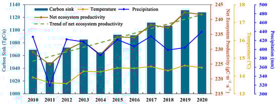 When searching for “ecosystem” and “net ecosystem productivity (NEP), a total of 3197 related articles were published from 2018 to 2022 on Web of Science. The vocabulary of these articles mainly includes topics in the study of “ecosystem”, “climate change”, “carbon cycle”, “forests”, “grassland”, etc. This indicates that the carbon cycle and CS of ES are attracting unprecedented attention with major national demands such as the construction of ecological civilization and “dual carbon” goals of China. On the global scale, Wang et al. [] used multi-scale remote sensing monitoring and inversion data, combined with the atmospheric inversion method, ecosystem carbon cycle model and machine learning model, to generate a 1° × 1° global terrestrial carbon flux dataset, discussed the mechanism of interannual variation in the global CS, and the impact of temperature and water changes on global terrestrial carbon sink in space the influence of temperature and water on the global CS in space. they thought that it is necessary to pay more attention to the differential effects of temperature change on the global terrestrial CS in the Northern Hemisphere to reveal the interannual variation therein. On the national scale, Zhang et al. [] used eddy covariance measurement to measure the NEP and gross primary productivity (GPP) of three typical grasslands in China, and analyzed the characteristics and driving forces of their interannual dynamic changes. Their research results show that both climatic factors such as temperature and precipitation, and ecosystem responses affected the interannual variation in grassland carbon fluxes. On the daily scale, carbon fluxes were mainly driven by climate factors, while on the annual scale, ecosystem responses weakened the effects of climate variability on carbon fluxes in the three grasslands. On the regional scale, Liu et al. [] used the soil respiration model and the improved Carnegie–Ames–Stanford approach model, estimated the vegetation NEP in Qinghai Plateau from 2000 to 2015 based on remote sensing data and analyzed the interannual dynamic variation characteristics and influencing factors of vegetation NEP. Their research results show that the annual NEP of Qinghai Plateau was gradually improved and became stable, precipitation and temperature jointly affect the change of vegetation NEP in Qinghai Plateau. The average correlation coefficient between vegetation NEP and precipitation in Qinghai Plateau is 0.075, and precipitation mainly promoted the vegetation NEP; the average correlation coefficient between vegetation NEP and temperature in Qinghai Plateau is –0.20, and temperature mainly inhibited vegetation NEP.